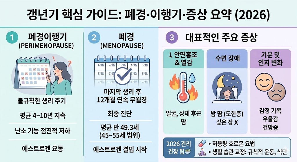 갱년기는 “이상해지는 시기”가 아니라 호르몬 변화로 몸의 설정이 바뀌는 기간이에요. 보통 폐경 전후를 말하고, 의학적으로 폐경은 다른 원인 없이 12개월 연속 생리가 없을 때로 봅니다.