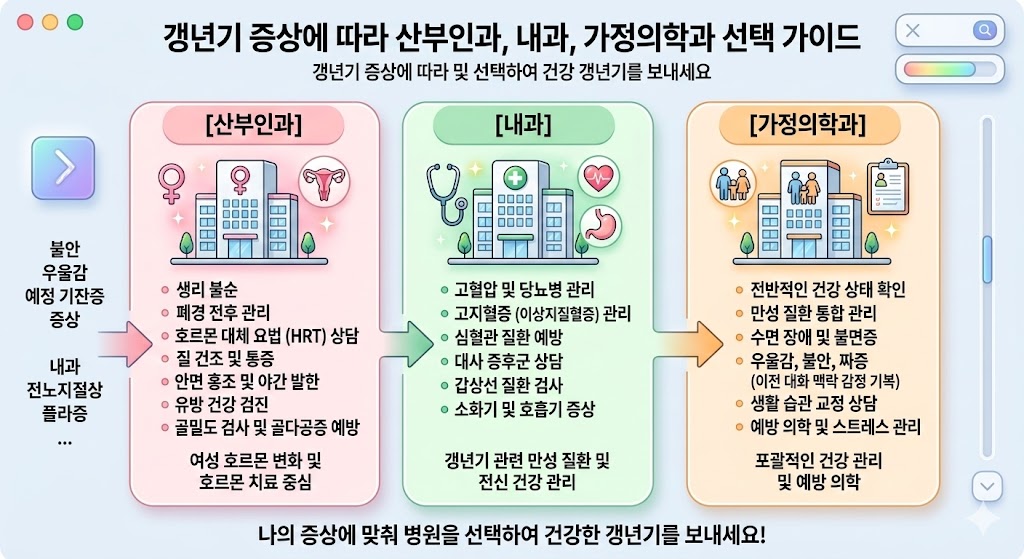 갱년기와 비슷해 보여도 실제로는 내과 질환이 숨어 있을 수 있어서, 건강검진 수치 이상이나 만성질환 관리가 중요하면 내과가 더 편할 수 있어요.